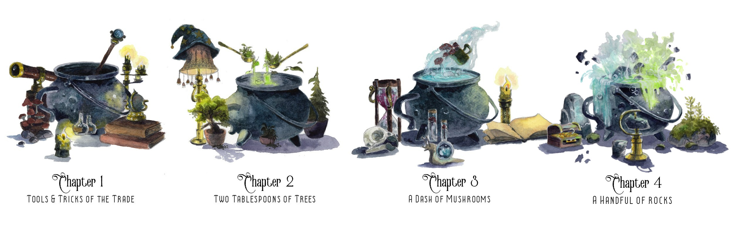 27 March 2025. Following the idea from the contents page, of each chapter heading like a step from a potion recipe, I wanted the illustration to also have a continuous storyline. Starting from an empty cauldron for Chapter 1: Tools & Tricks of the Trade to a bubbling blue-green potion in Chapter 4: A Handful of Rocks to a celestial explosion in Chapter 5: And a Hint of Salt.