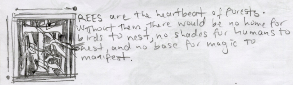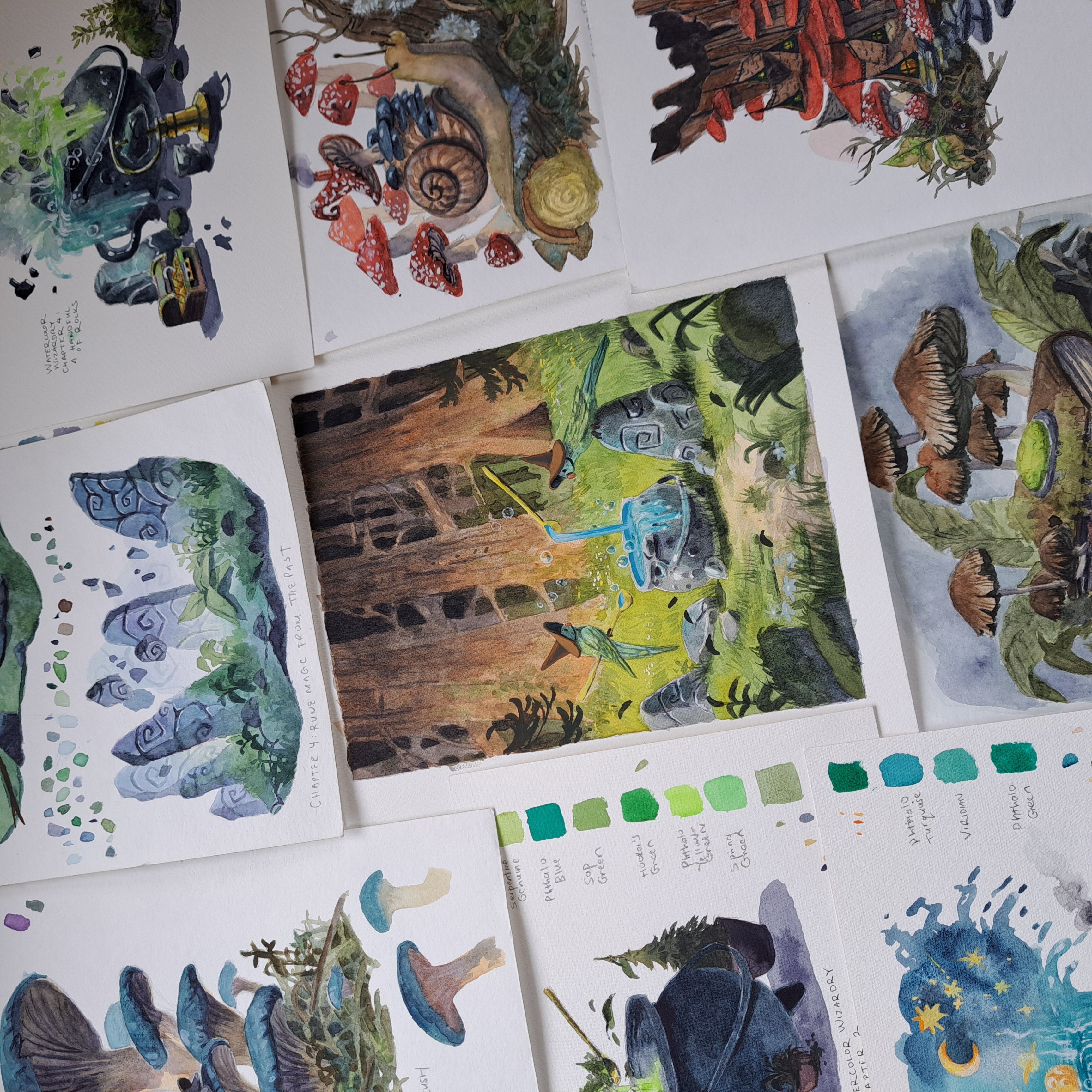 Riding that idea where the reader is a wizard apprentice learning to create their own watercolor dimension, I had so much fun thinking of chapter names and tutorial titles. I knew roughly that I wanted to segment the book according to different areas of a forest. Because forests aren't just all trees - but also mushrooms, animals, flowers, and rocks and moss.
