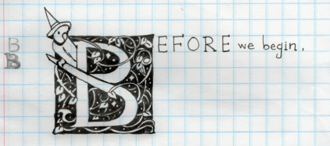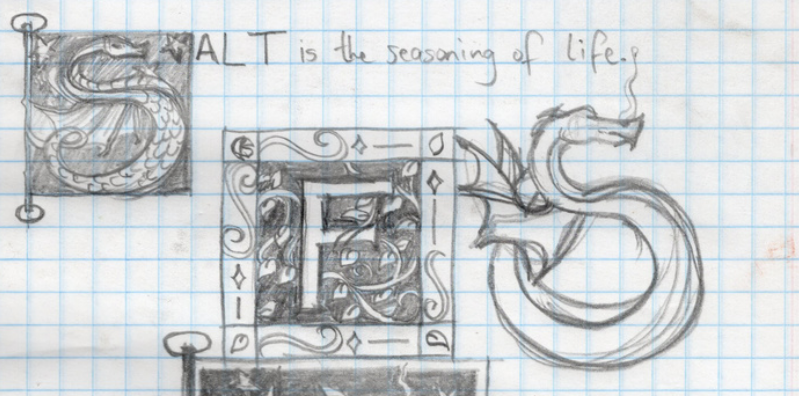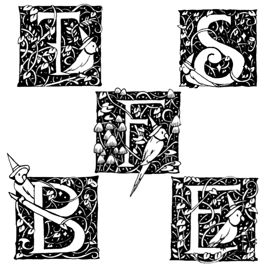 I scrapped a few first attempts until I finally landed on a design I liked, one of my inspirations being an artist named Florence Harrison. Another inspiration was the classic medieval style drop cap, one that you'd find in fairytale books and other old fantasy books. Here I was drawn by the small symbols that enhance the meaning of the text - instead of a large full-blown illustration, small symbols could still tell a story.